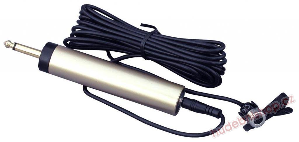 Klopový mikrofon s elektretovou vložkou. Klipsový držák. Válcové pouzdro pro tužkovou baterii s konektorem JACK 6,3 mm pro zasunutí do mixu a se zásuvkou 3,5 mm pro připojení kabelu od mikrofonu. Molitanová krytka. Frekv. rozsah: 50Hz - 18kHz, citlivost: - 65dB, impedance: 1000 Ohm, napájení 1,5V tužková baterie.
