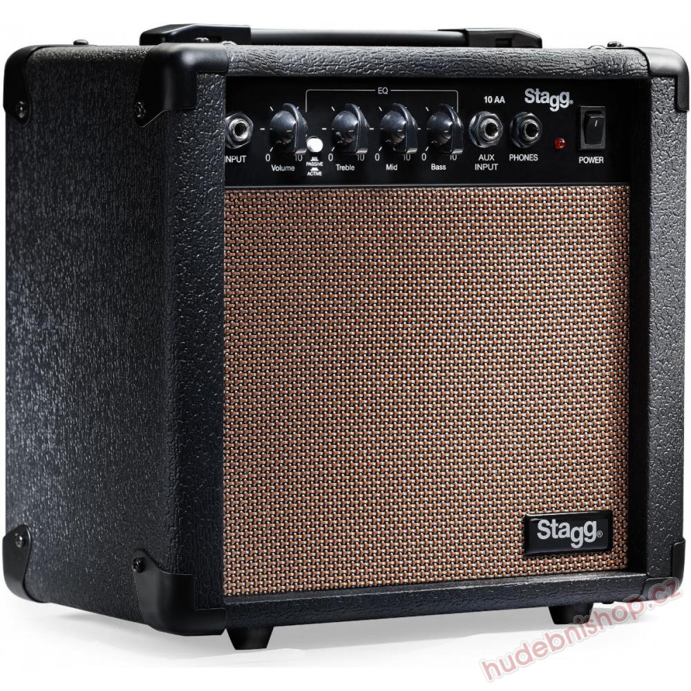 Kombo pro akustické kytary, zesilovač 10 W RMS, 6,5“ reproduktor, vstup 6,3 mm jack s přepínáním aktivního nebo pasivního snímání, ovládání hlasitosti, třípásmový ekvalizér, vstup 6,3 mm jack CD/MP3 a výstup 6,3 mm jack na sluchátka. Povrchová úprava béžový vinyl, rozměry 27 x 28 x 17 cm.