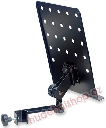 Notový pult s ramenem a šroubem k upevnění na stojan o průměru 14 - 35 mm, rozměry pultíku 31,5 x 24 cm, hmotnost 1,05 kg, černý.